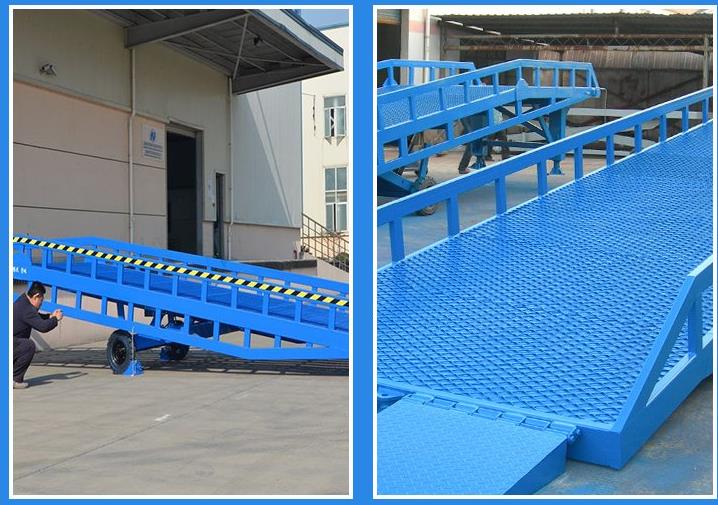 移動式液登車橋是與叉車配合使用的貨物裝卸輔助設備。移動式液登車橋是與叉車配合使用的貨物裝卸輔助設備。采用人工液壓動力,勿須外接動力電源即可輕松實現登車橋的高度調節。可調節長度的索鏈用于鉤住車輛,使登車橋與車輛即使發生移位時,始終緊密貼合。移動輪采用實心輪胎,不用充氣,堅固,配合剎車墊,保證作業安全。